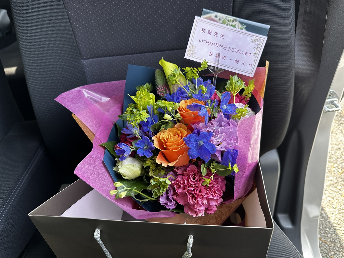 また、秋葉先生の教授昇進祝いとして花束と日本酒をプレゼントしました。喜んでいただけて良かったです。